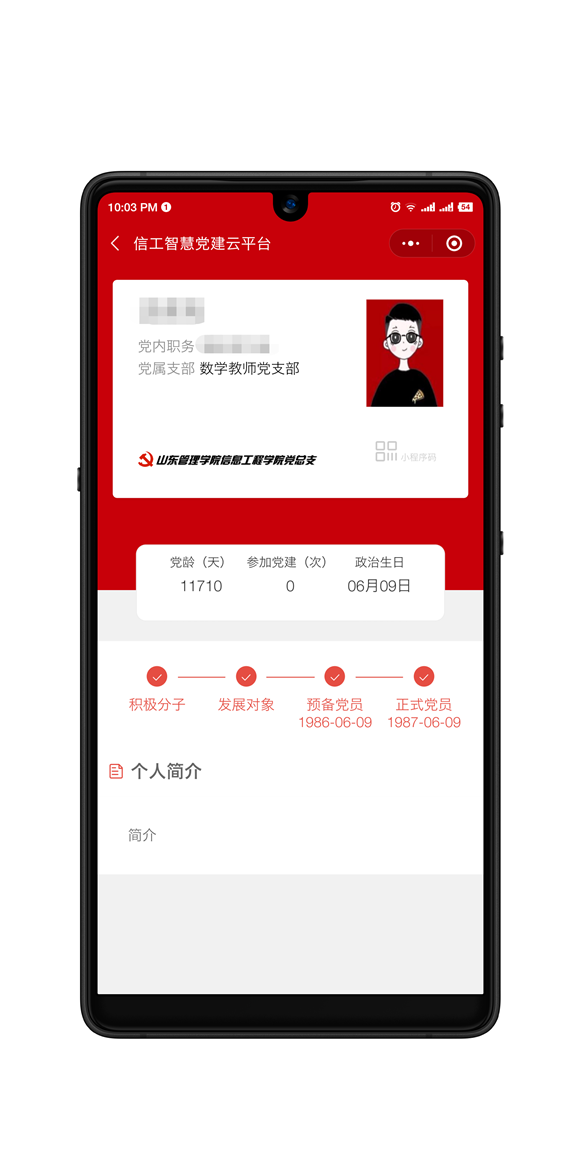 政治生日是黨員的第二生日,黨員同志可以看到實(shí)時(shí)更新的黨齡天數(shù)、個(gè)人從入黨積極分子到發(fā)展對象、到成為預(yù)備黨員、轉(zhuǎn)為正式黨員的歷程,參加活動(dòng)、學(xué)習(xí)的次數(shù),以及榮譽(yù)記錄,增加黨員的政治身份自豪感和使命感。