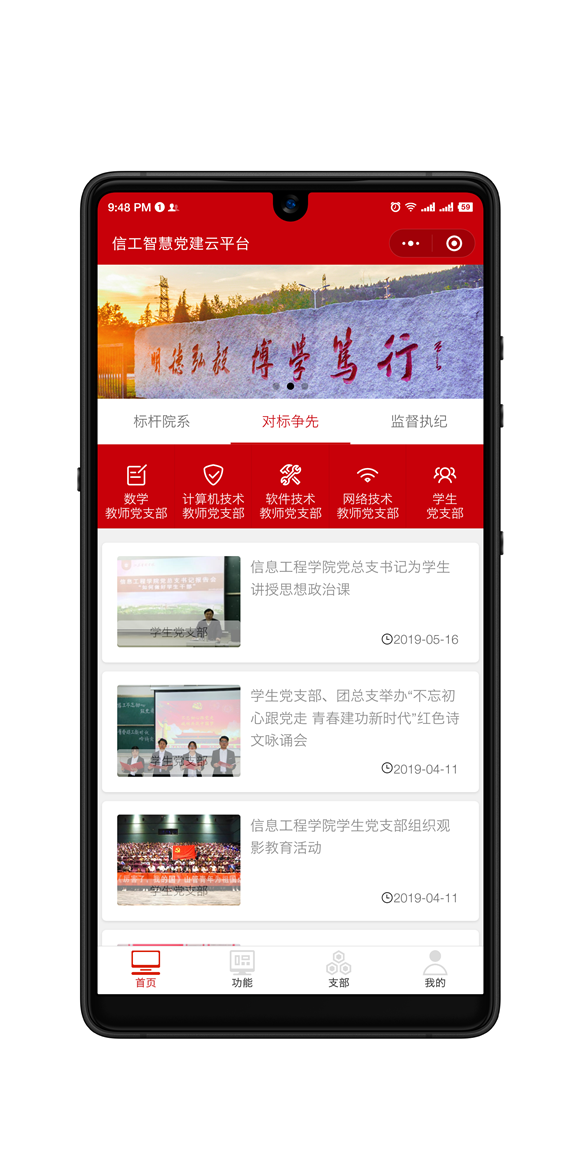 2019年3月,信息工程學(xué)院黨總支獲評山東黨建工作標(biāo)桿院系培育創(chuàng)建單位,為認(rèn)真落實(shí)培育創(chuàng)建要求、重點(diǎn)任務(wù),優(yōu)化創(chuàng)建方案,高質(zhì)量完成建設(shè)任務(wù),信息工程學(xué)院黨總支自2019年初開始設(shè)計(jì)并搭建了“山管信工智慧黨建云平臺”。