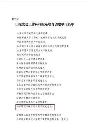 2019年3月,山東省委教育工委發(fā)布《山東黨建工作示范高校、標(biāo)桿院系、樣板支部培育創(chuàng)建單位評(píng)選結(jié)果公示》,經(jīng)專家評(píng)審,遴選產(chǎn)生了5個(gè)高校黨委、50個(gè)院系黨組織、161個(gè)黨支部作為山東黨建工作示范高校、標(biāo)桿院系、樣板支部培育創(chuàng)建單位。山東管理學(xué)院信息工程學(xué)院黨總支被評(píng)為山東省黨建工作標(biāo)桿院系培育創(chuàng)建單位。