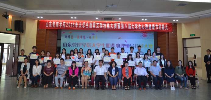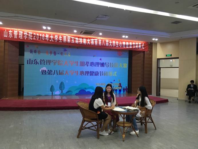 2016年5月25日下午13:30,以“新體驗·筑夢想·促成長”為主題的山東管理學院第八屆大學生心理健康節(jié)系列活動之“大學生朋輩心理輔導技能大賽”決賽在圖書館二樓報告廳舉行,各二級學院分管學生的副院長及部分學院的學工辦主任、心理輔導站負責人出席此次比賽并擔任評委。共有來自八個學院的近500名學生觀看了比賽。